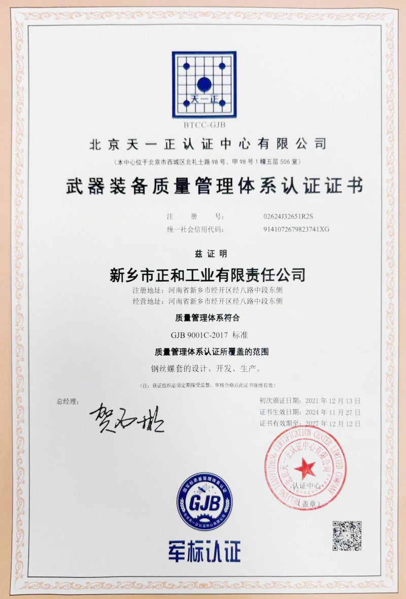公司于2008年8月29日取得了中國(guó)新時(shí)代認(rèn)證中心軍工產(chǎn)品GJB9001B-2009質(zhì)量管理體系認(rèn)證證書(shū),并繼續(xù)保持。